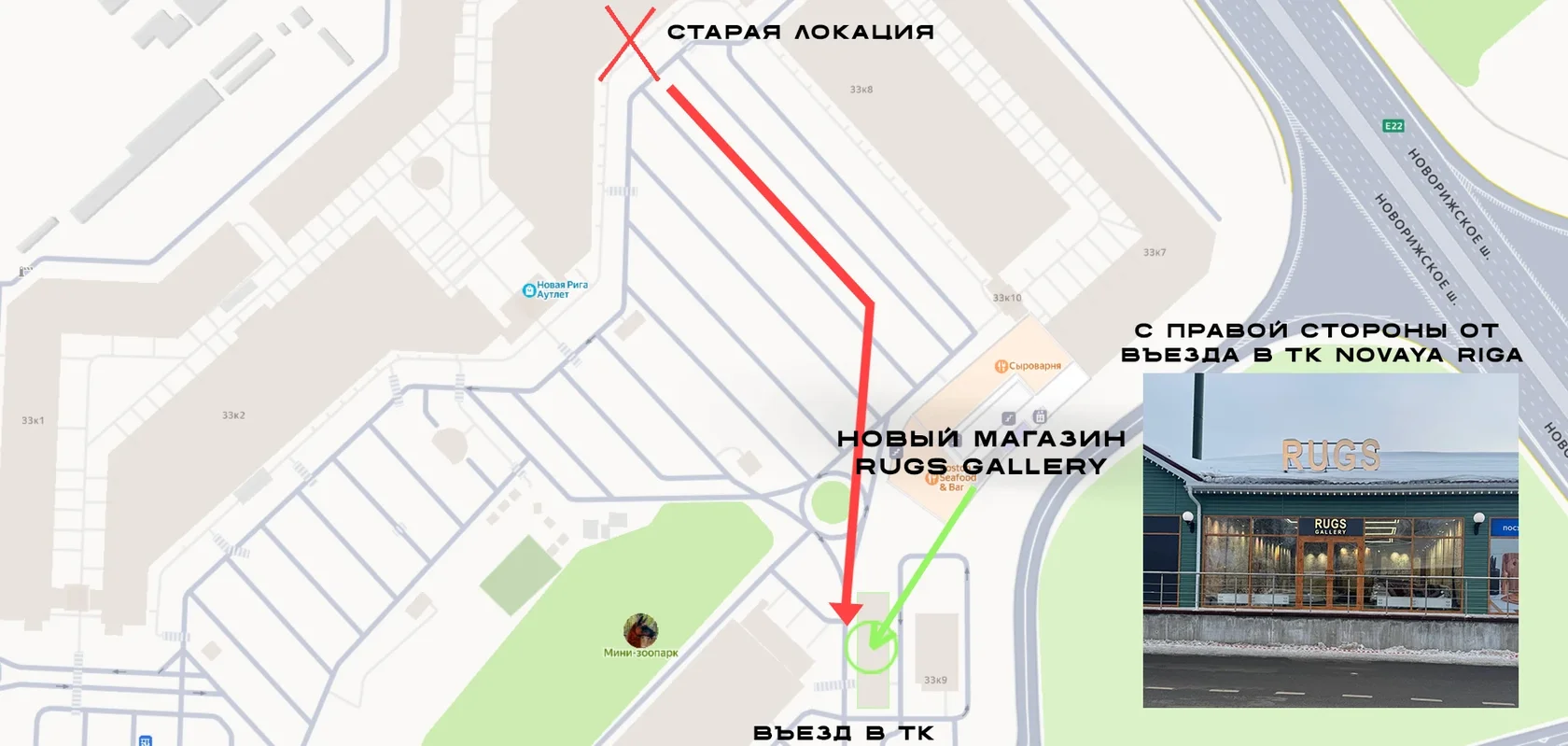 Мы переехали в новое помещение в том же комплексе ТК Novaya Riga Outlet, и теперь находимся ближе ко въезду в ТК. Новое местоположение можете увидеть на иллюстрации ниже.